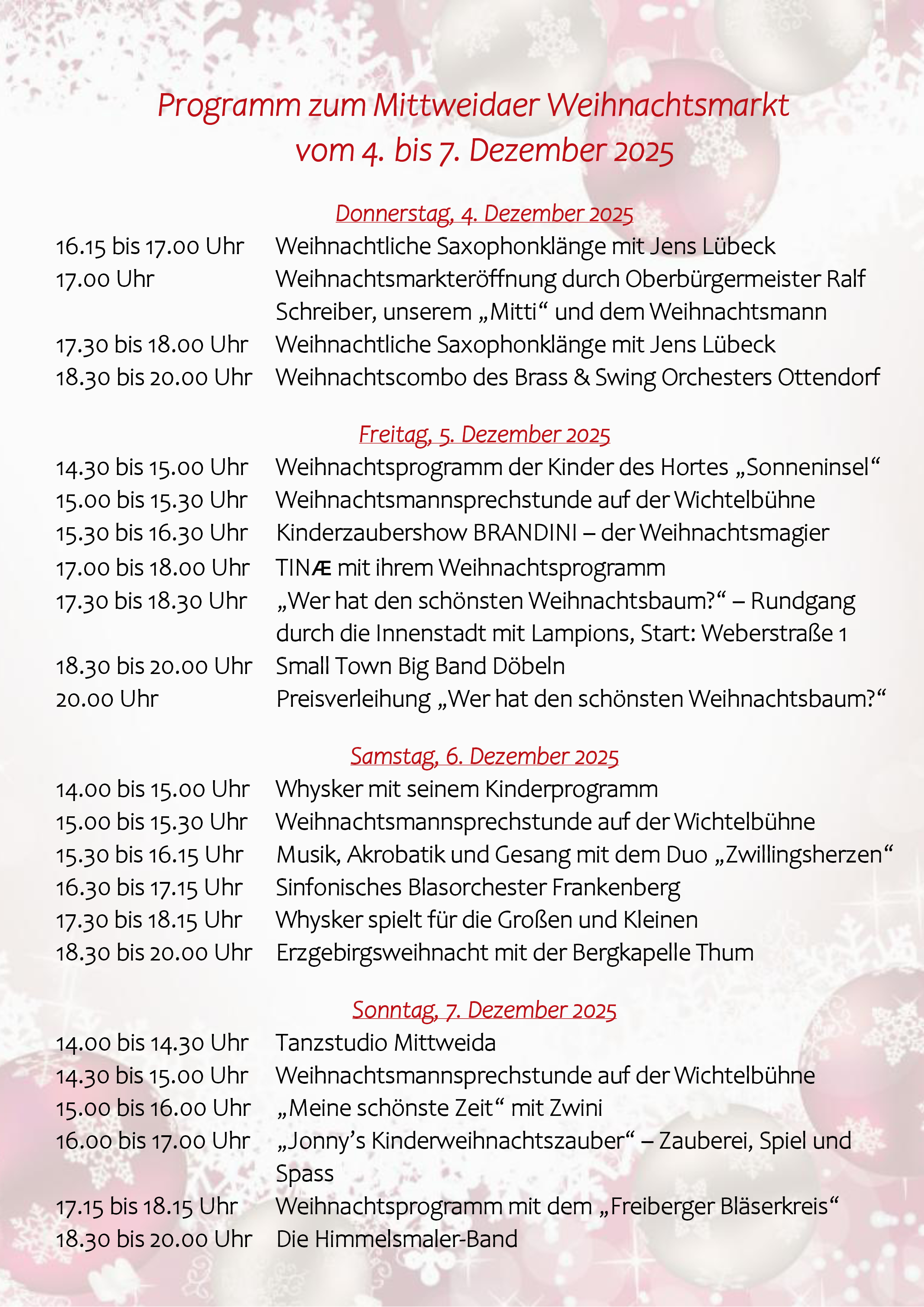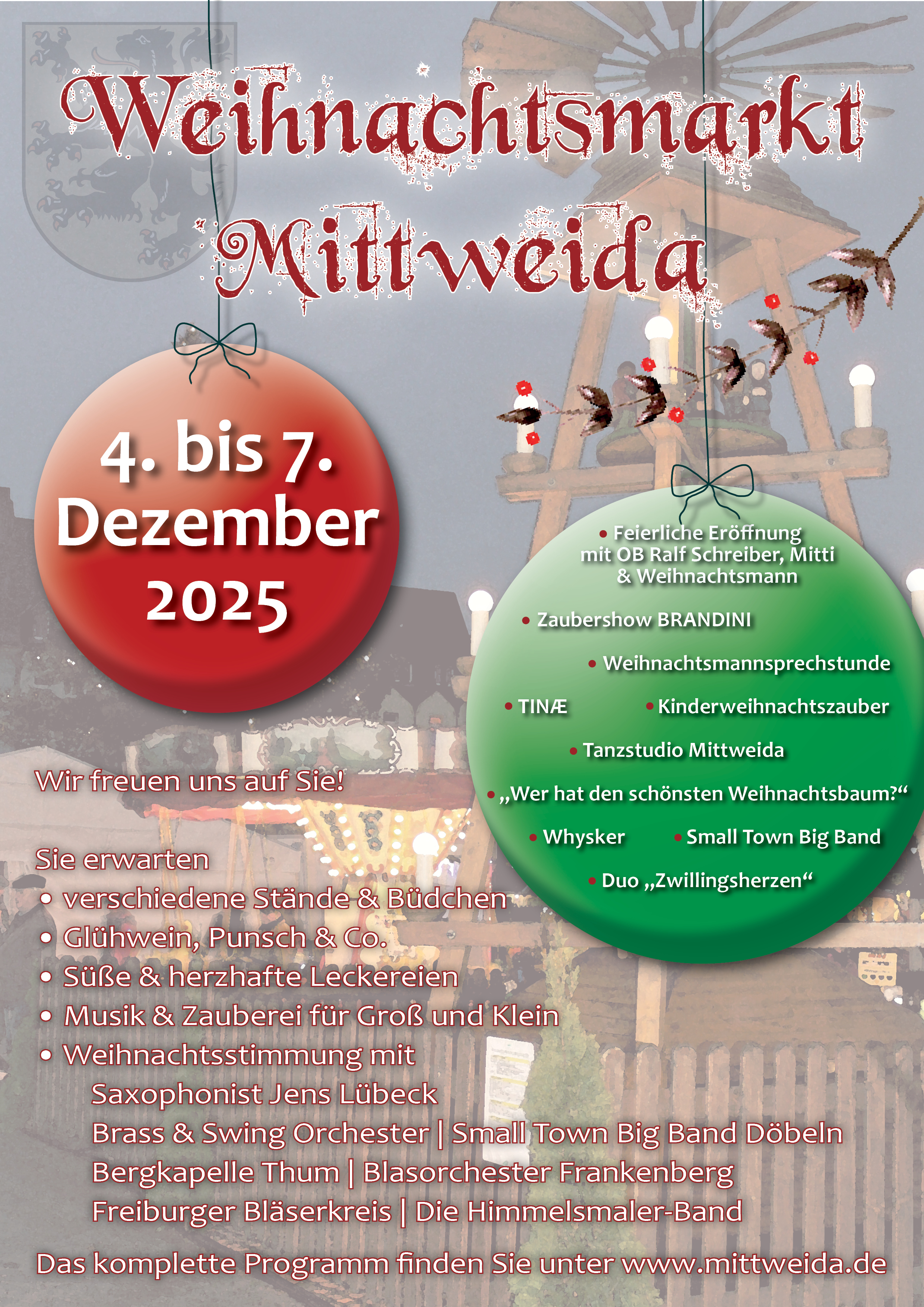 Vom 4. bis 7. Dezember 2025 lädt die Stadt Mittweida herzlich zum diesjährigen Weihnachtsmarkt ein. Freuen Sie sich auf ein stimmungsvolles Fest mit duftendem Glühwein, süßen Leckereien, herzhaften Spezialitäten und musikalischer Unterhaltung – die für echtes Weihnachtsfeeling sorgen.