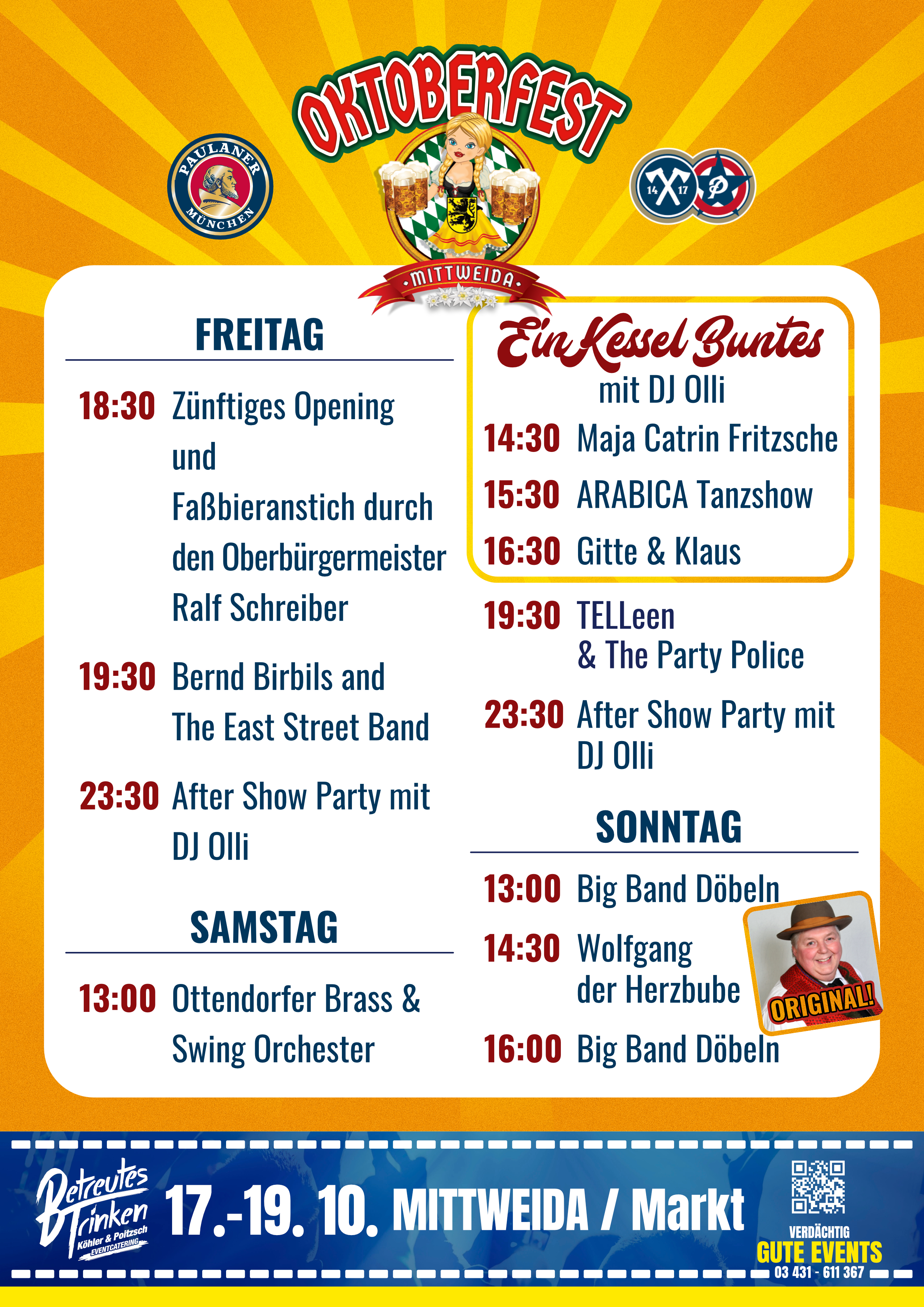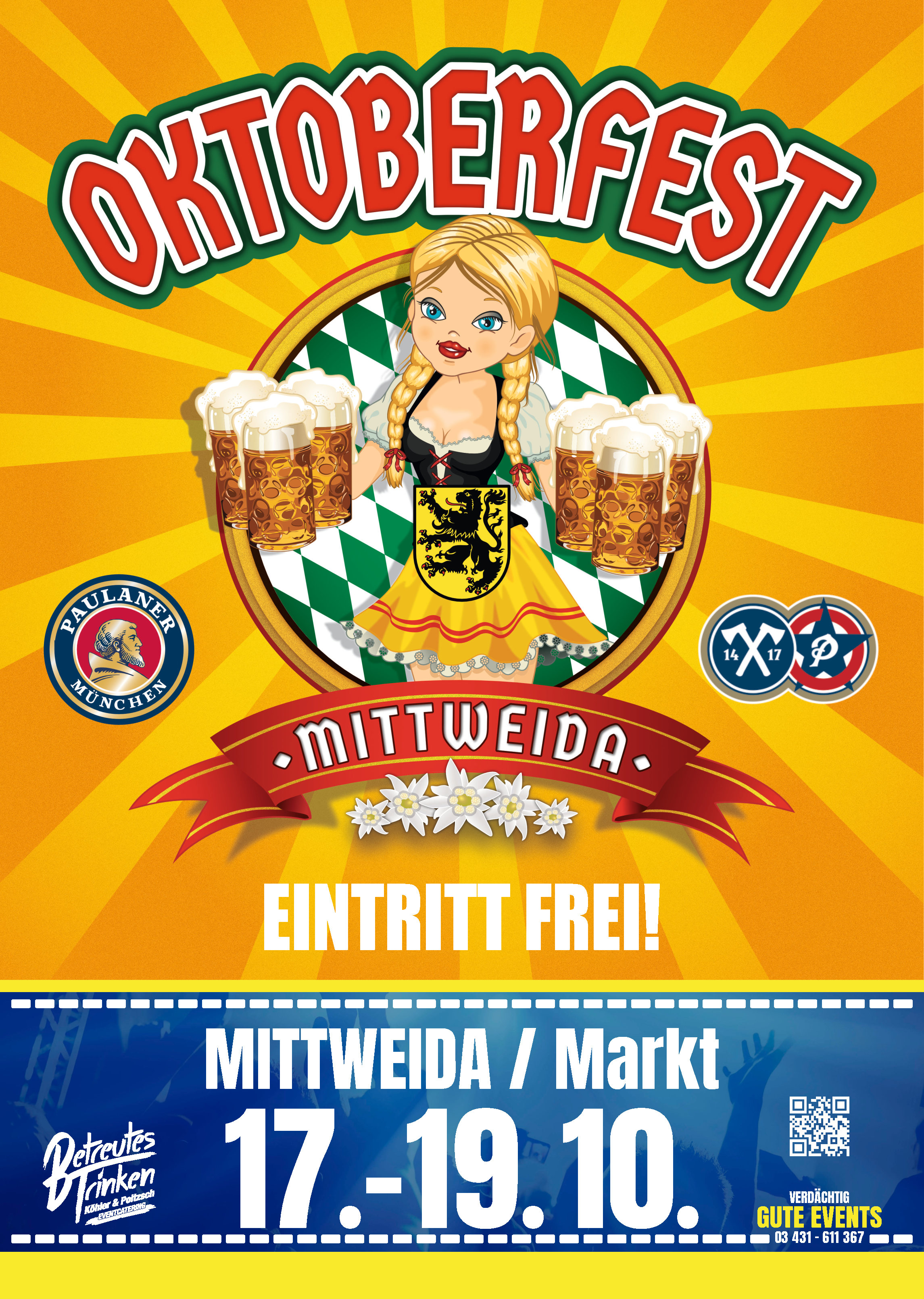 Vom 17. bis 19. Oktober lädt die Stadt Mittweida und Köhler & Poitzsch Eventcatering zum traditionellen Oktoberfest ein. Drei Tage lang erwartet die Besucher urige Stimmung, beste Unterhaltung und natürlich kulinarische Schmankerl im Festzelt.