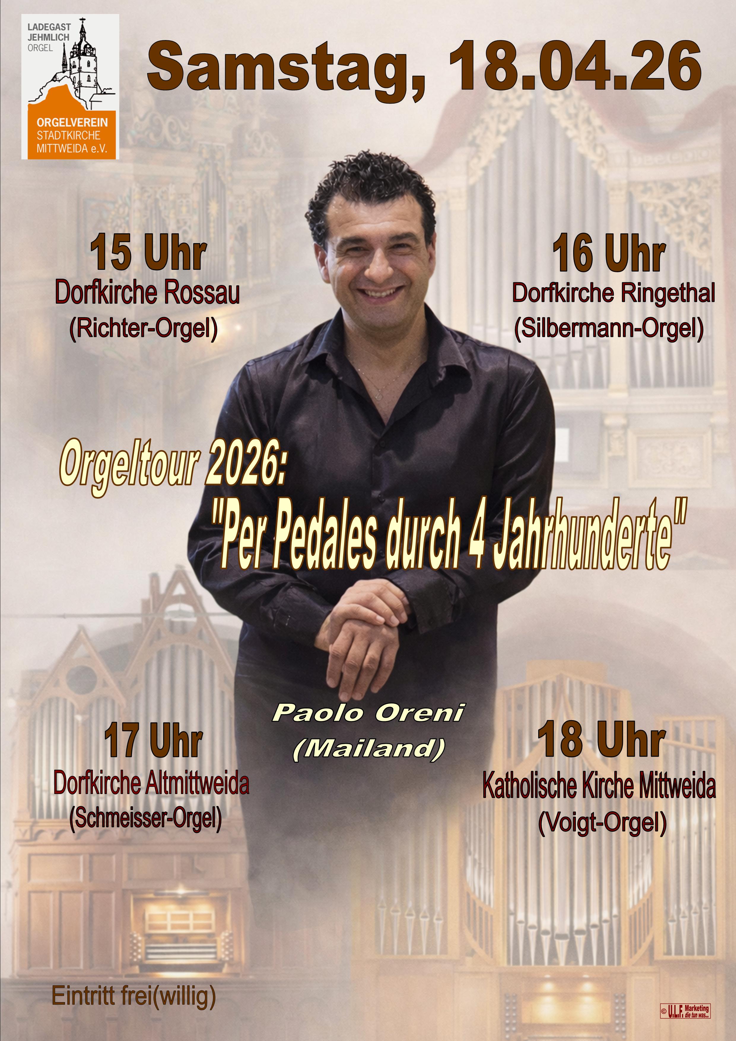Der renommierte italienische Konzertorganist Paolo Oreni wurde 1979 in Treviglio geboren und in Italien, Luxemburg und Frankreich im Orgelspiel ausgebildet. Er ist Preisträger namhafter Wettbewerbe, gibt Kurse in Orgel-Meisterklassen und berät bei Orgelbauprojekten. Seine virtuosen Konzerte führen ihn durch die Orgellandschaft ganz Europas (siehe auch: www.paolooreni.com). Paolo Oreni ist im April 2026 in Mittweida und den umliegenden Ortschaften zu Gast, nun schon zum dritten Mal nach 2024 und 2025.